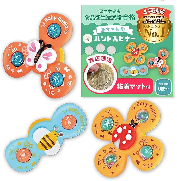 こちらの商品は赤ちゃん向けのハンドスピナーです。6歳以下対象玩具の試験に合格した安全性の高いハンドスピナーのため、0歳から遊べます。視覚や聴覚を刺激したり手の運動能力をアップさせたりするだけでなく、集中力をはじめとする脳の発達を促す効果もあるおもちゃです。また、裏側についている吸盤でドアや壁、テーブルにくっつけて遊ぶこともできます。