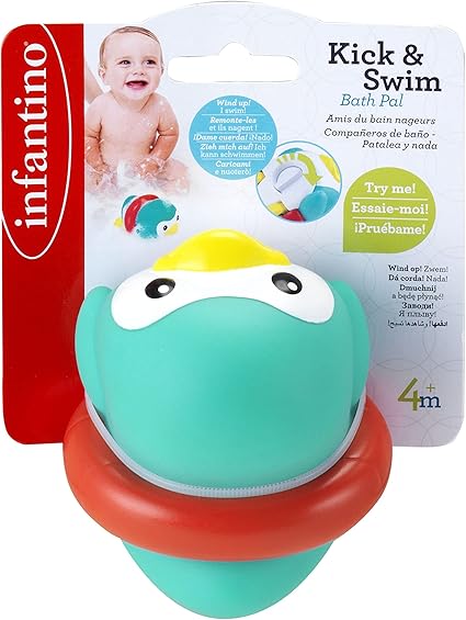 「ワインドアップペンギン」は、ペンギンのゼンマイ式のおもちゃです。お腹のゼンマイを回すと足が動き、水面を進む様子を観察できます。動きがわかりやすく、子供が目で追いやすい形状です。約4ヶ月頃から使える軽量タイプで、握りやすい大きさになっています。ゼンマイを回す動作では指先を使うため、日常の遊びの中で手を動かす経験が増えやすい点も特徴です。シンプルな構造のため扱いやすく、お風呂場でも使いやすいアイテムです。